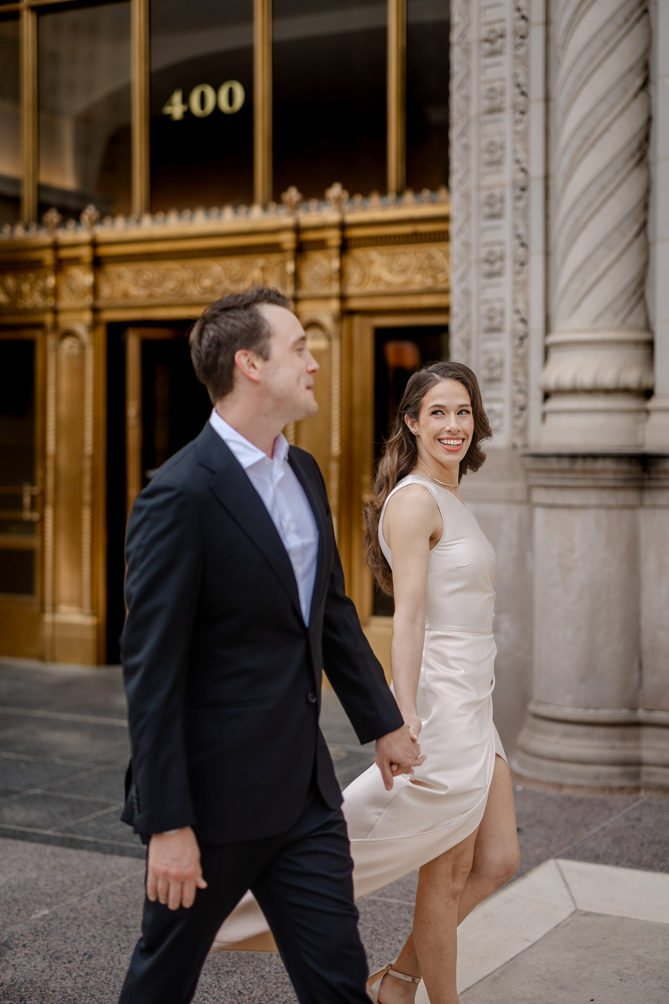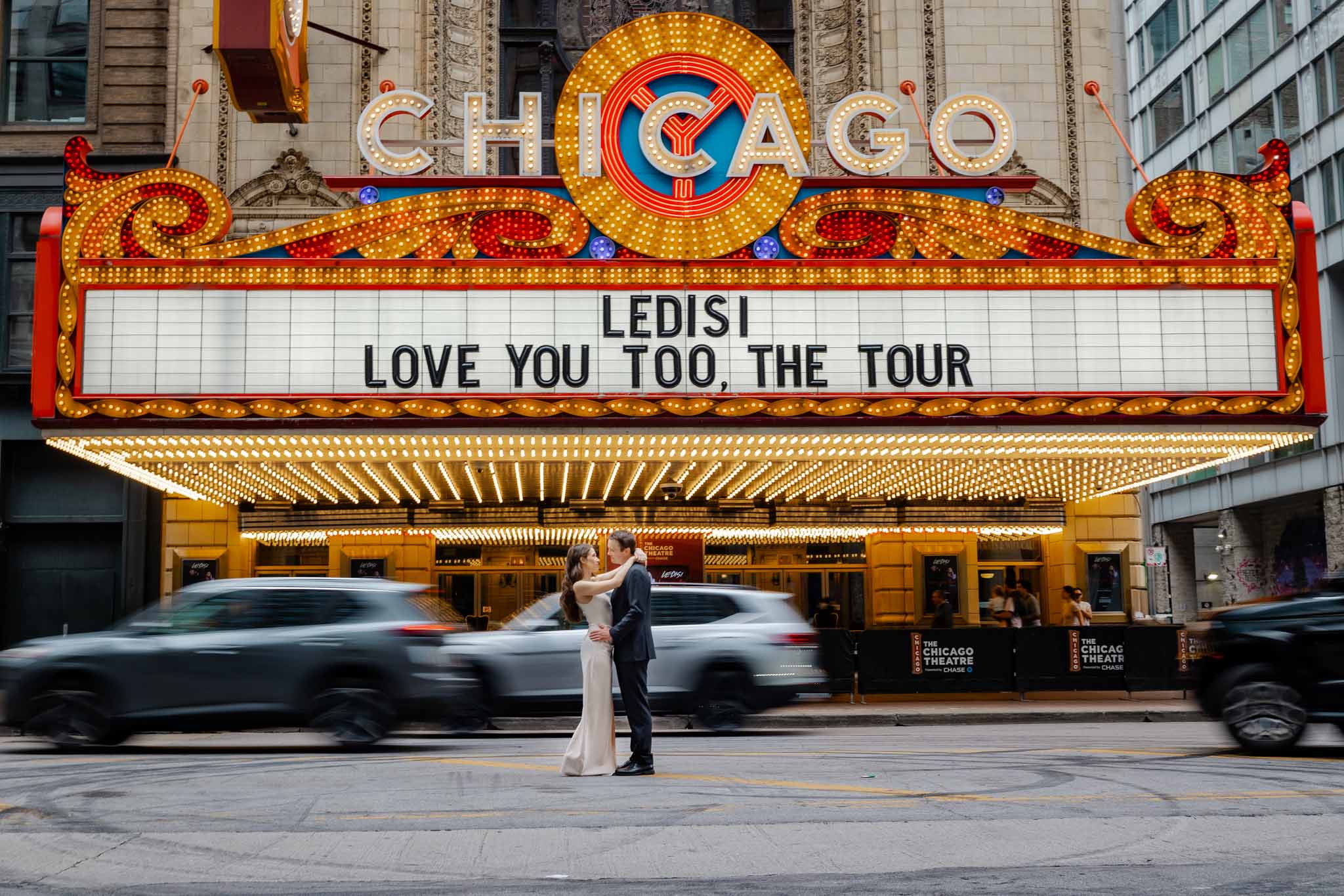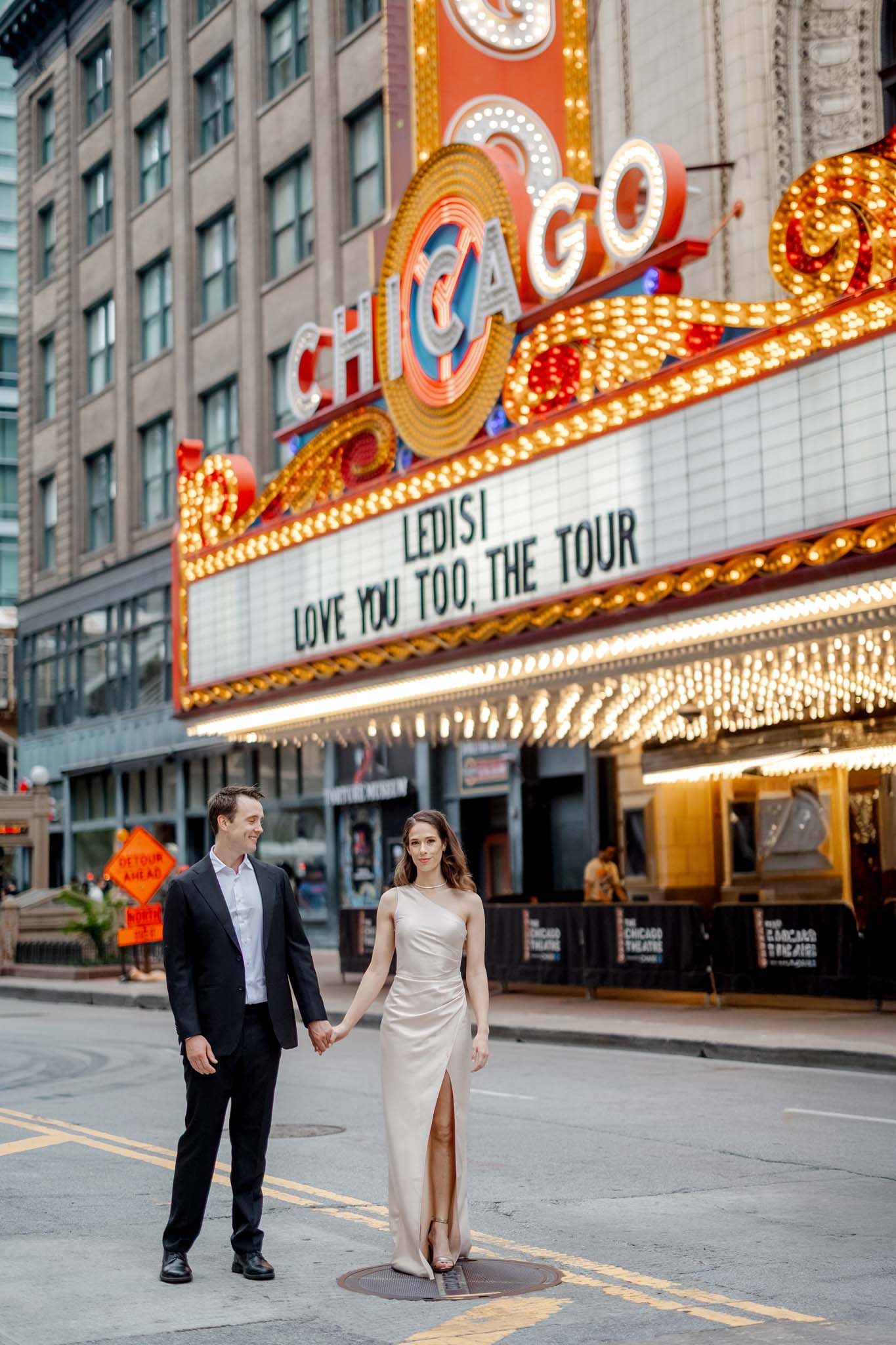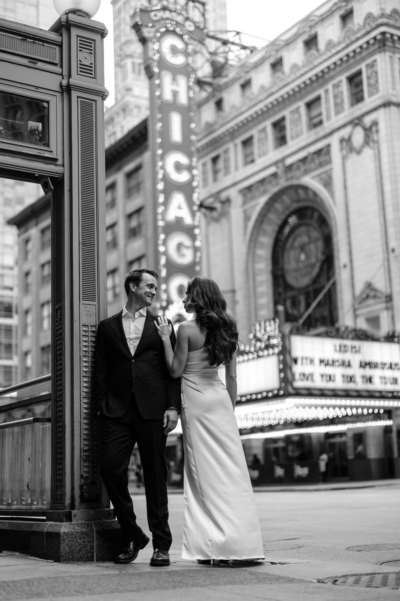 We made a rough plan of where we’d go and what spots we’d photograph — we always do that because it makes everything smoother. Of course, there are always unexpected and spontaneous moments along the way, and that’s the true beauty of what we do. We wrapped up the session under the iconic Chicago Theatre sign. Everything turned out perfectly — just like the photos we’re excited to share with you.