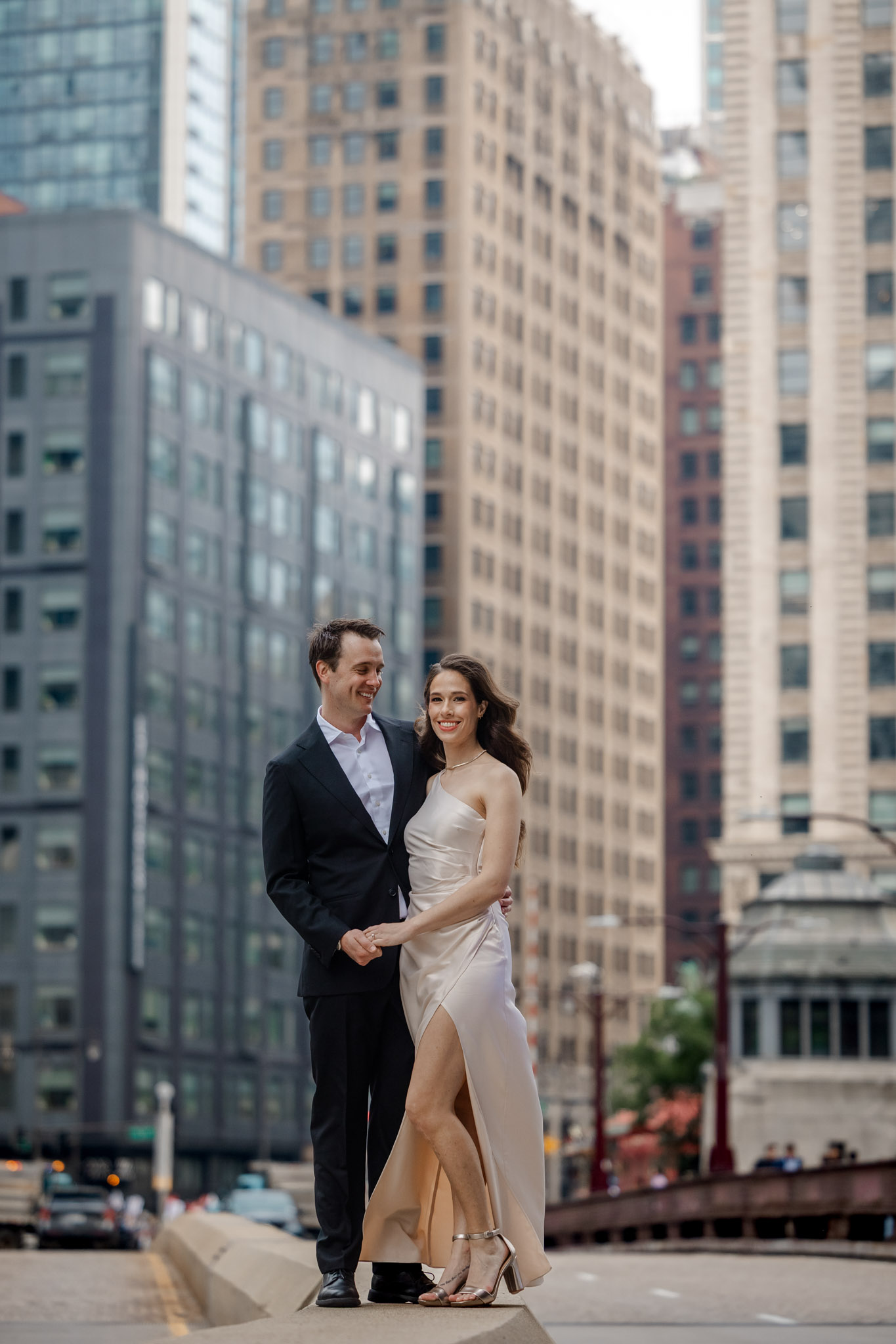 They were beautifully dressed, the engagement ring was stunning, and every glance and touch between them reflected the deep love they share. We were lucky that it wasn’t too crowded near the Wrigley Building, so we moved through that spot quickly. We know every corner of these locations by heart, and along the way, we happened to come across a group of police officers — and ended up taking a fun photo with them that will definitely be remembered.