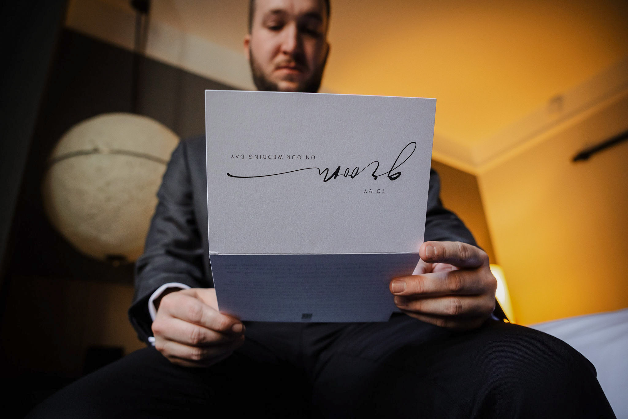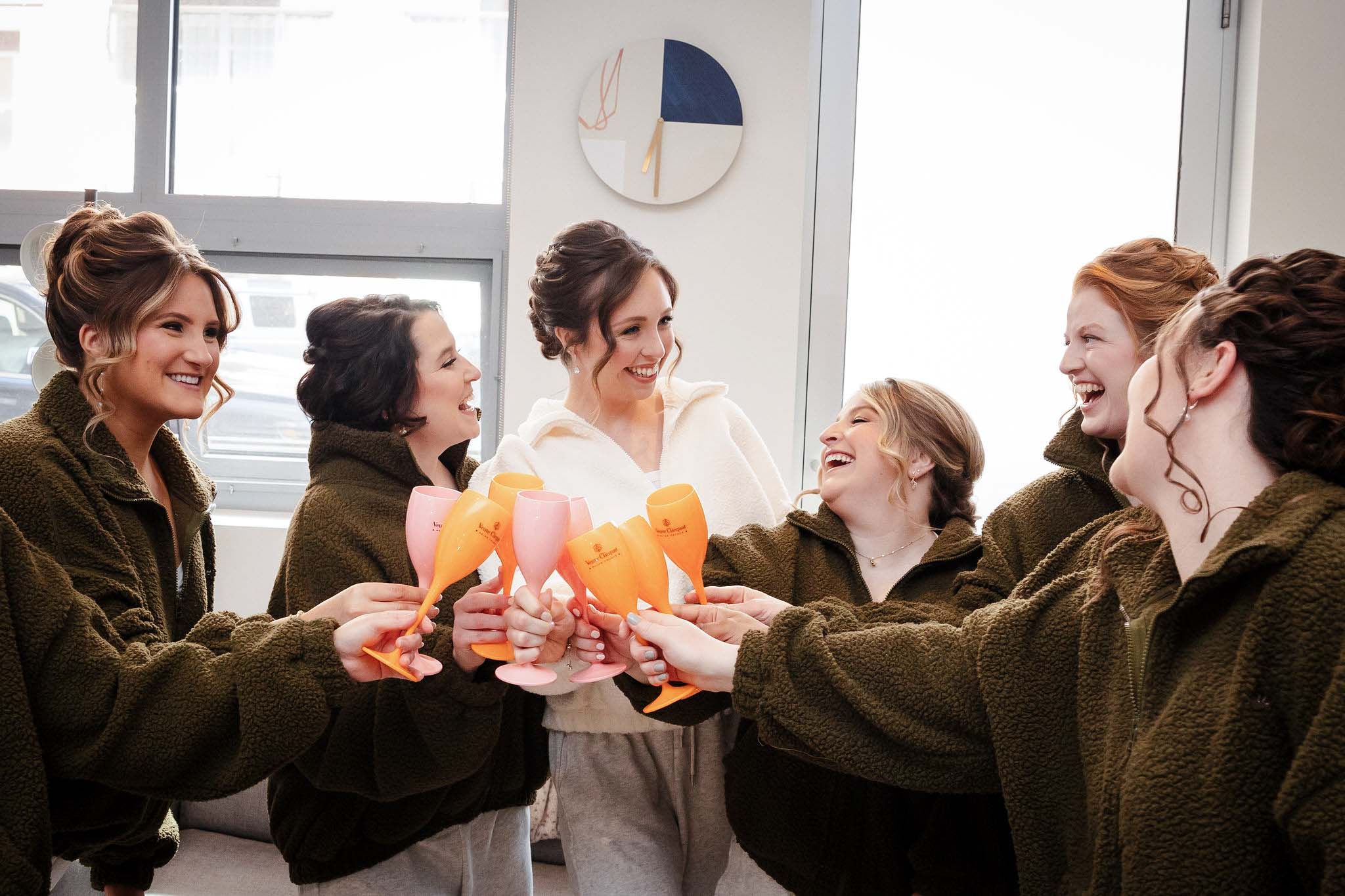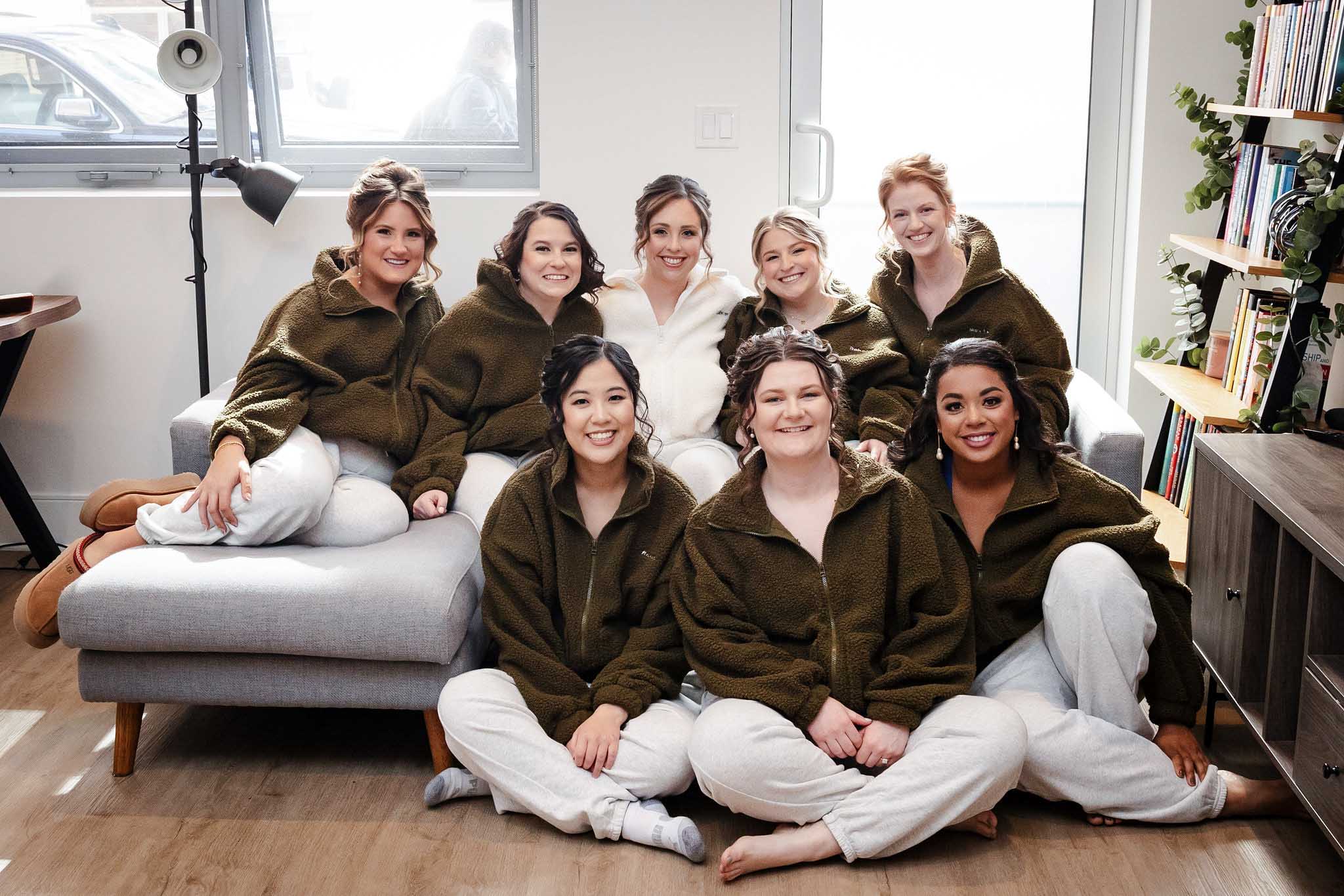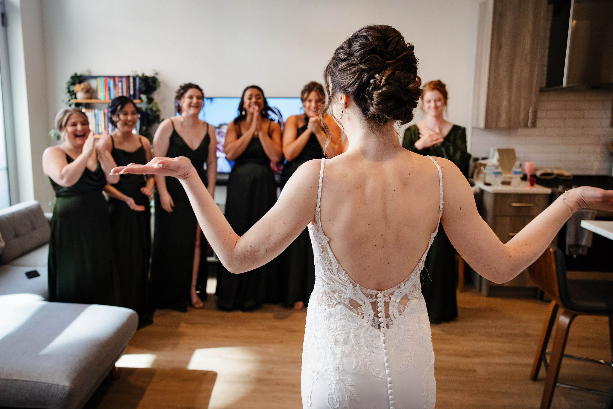 We met Allison and Aaron when we photographed their engagement last year. We chose North Avenue Beach, and it turned out to be a great choice. At the time, they wanted to include their dog in the photos—a lovely little gray dog they’re very attached to. I saw just how much he means to them later, when I photographed their wedding—their apartment is filled with his photos. They are a beautiful couple. We spent quite some time planning the locations for their couple and wedding party photos. They had a large wedding party, and when that’s the case, it’s always important to have a solid plan for choosing locations—especially since Chicago is always full of tourists.Allison got ready at their apartment in West Loop, while Aaron got ready at the Kimpton Gray Hotel. Allison was very excited, and we captured some beautiful moments during the prep. Her bridal party was cheerful and full of energy. We also took a few stunning portraits of Allison—her eyes have the most incredible color, and we really wanted to highlight that, which we managed to do perfectly. Aaron was also having a great time at the hotel with his groomsmen.