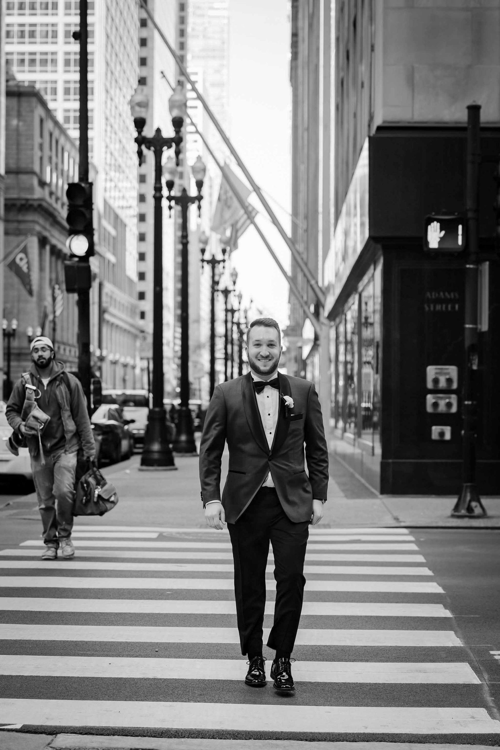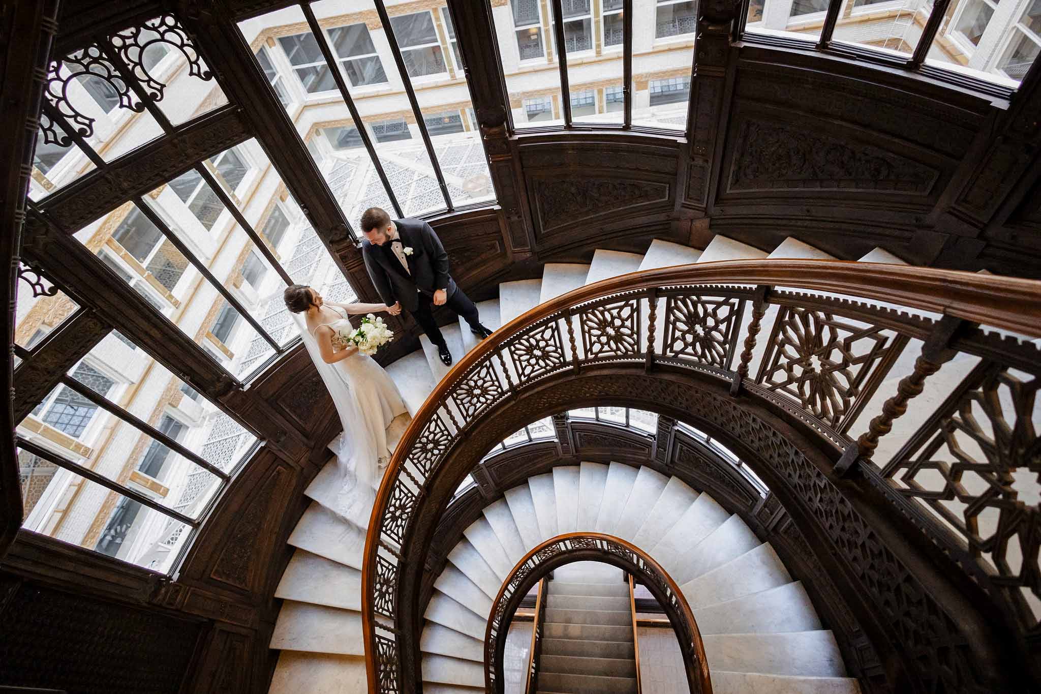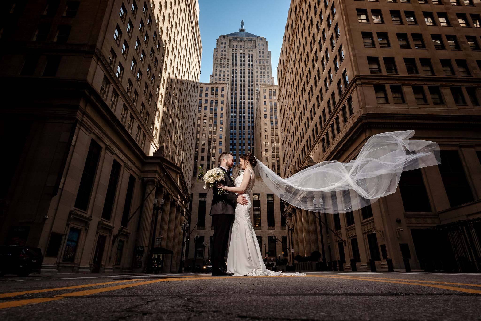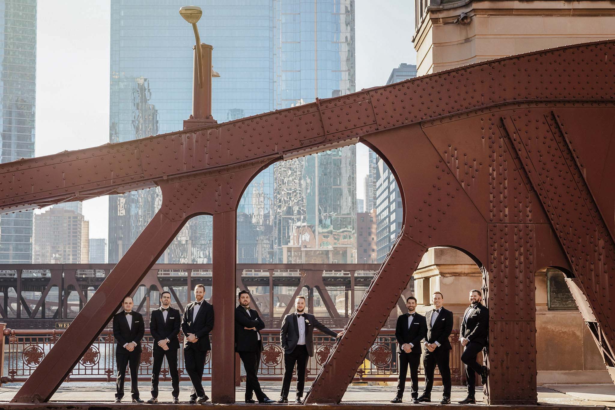 Anyone who knows Chicago, even just a little, has heard of the Rookery Building—a place with the most beautiful spiral staircase in the city.They wanted something special for their first look, and they chose this historic location. We planned carefully to decide where exactly everything should happen. First came the first look with her father, followed by the one with the groom. It was an emotional experience, and we picked two different spots—one for her father and another for the groom. After the first look, they read their vows to each other, which was incredibly touching. They didn’t have a videographer, but one of the photographers recorded it on a phone so they could have this beautiful moment captured on video as well.We love this location, and after the first look, we took some stunning photos on the beautiful staircase of the Rookery Building. The wedding party was waiting for us outside the building, right in front of the Board of Trade, where we continued our photography with them and the bridal party. The Board of Trade is always an inspiring backdrop for us. There was one moment when Allison’s veil blew away, and we managed to capture it perfectly. You can see that photo in the gallery below.Another iconic location we stopped by on our way to the venue was LaSalle Bridge, which provided us with some amazing photo opportunities. The sun was shining brightly, and we took full advantage of it. We love working with the sun, even though many photographers shy away from it and prefer shooting in the shade. The light added something special to the photos, making them even more beautiful.