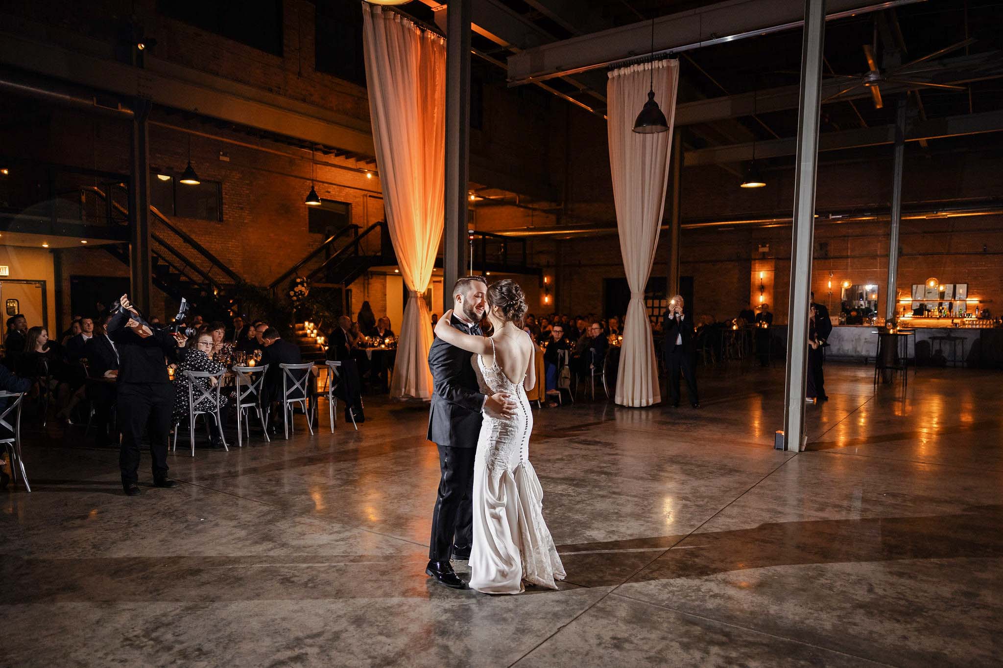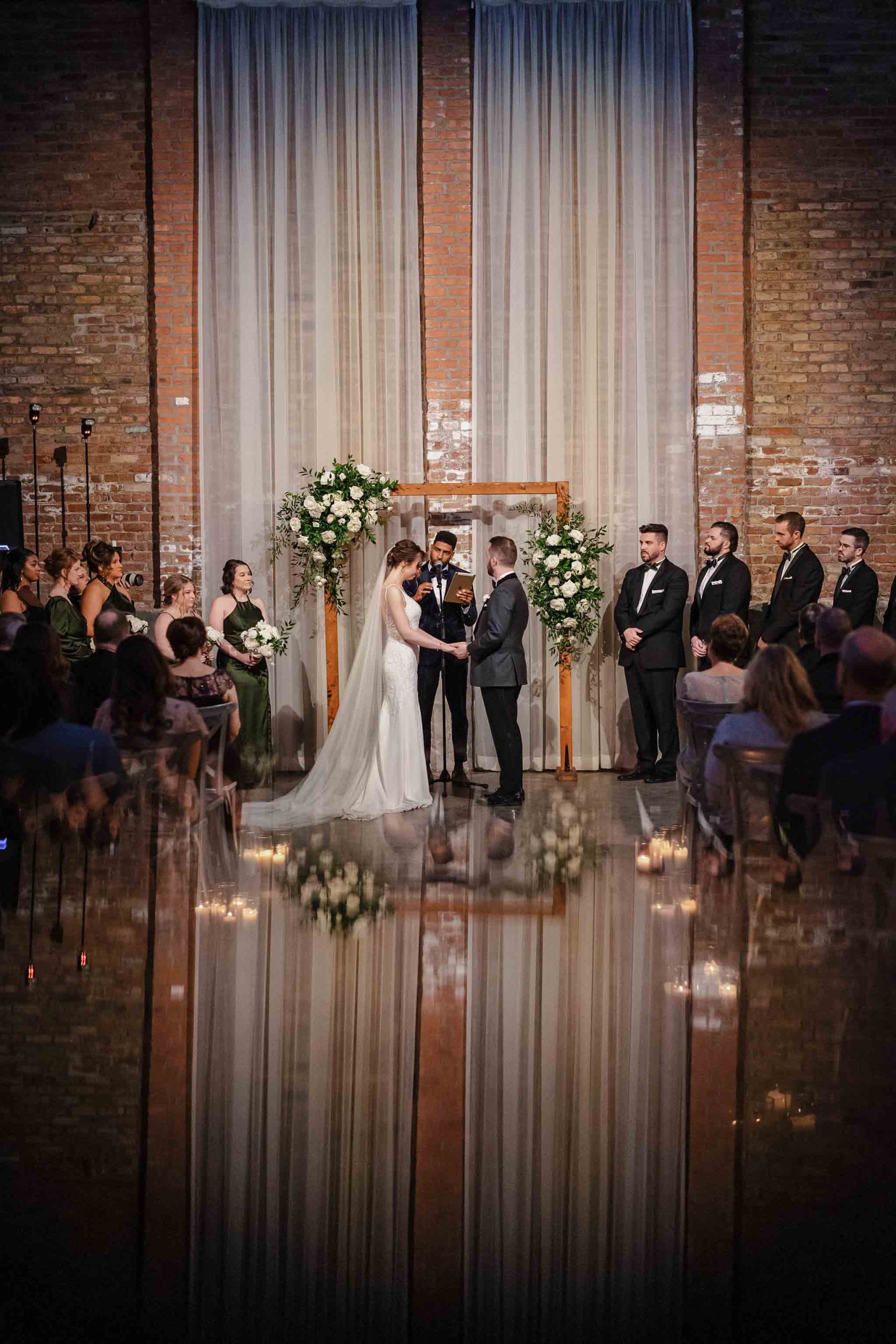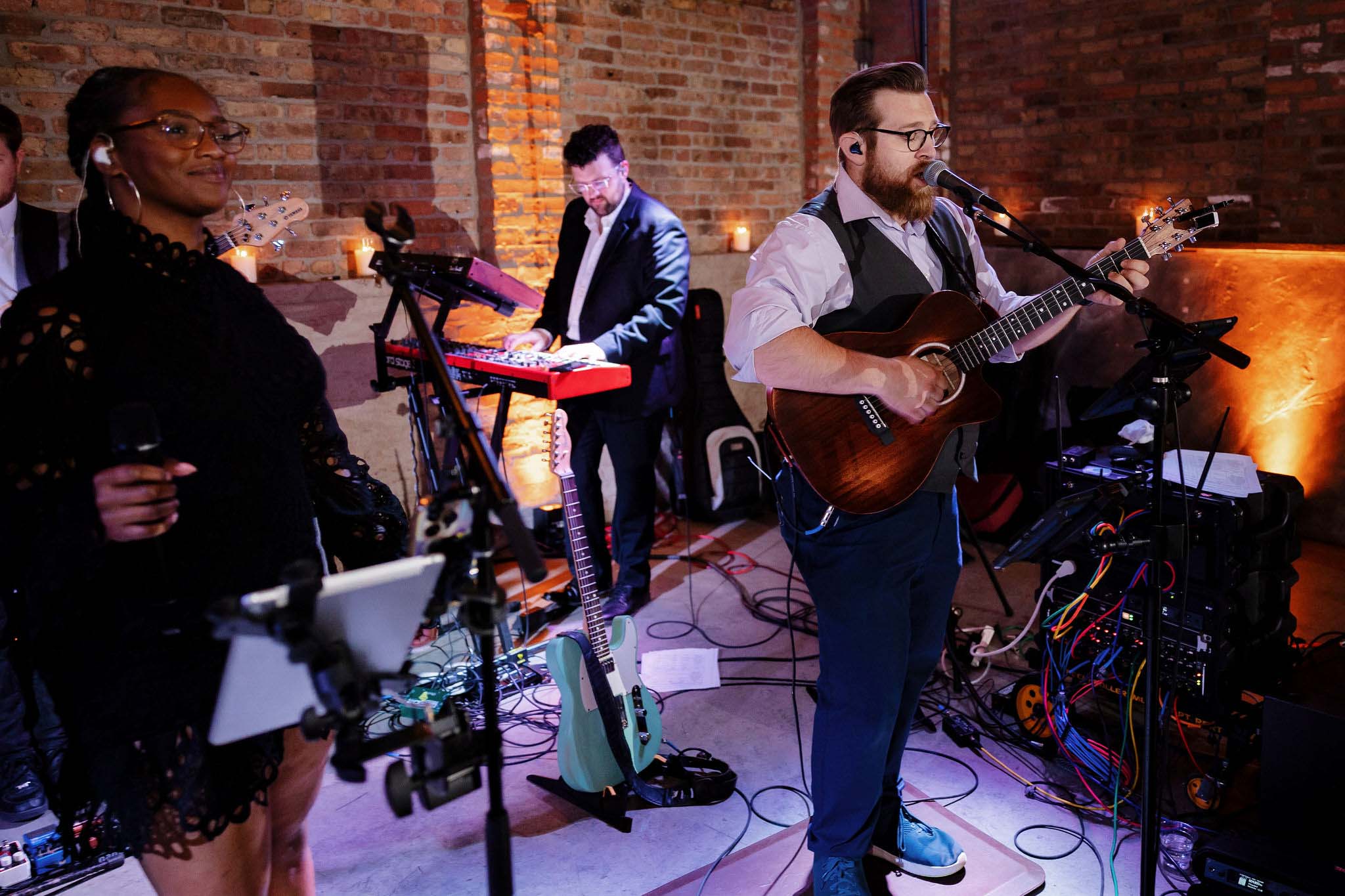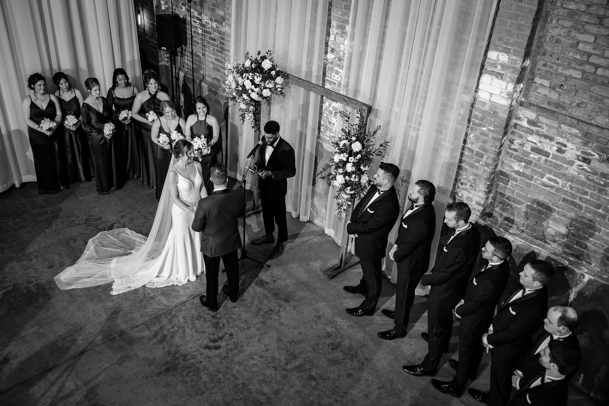 Fairlie is a relatively new event space located in the industrial area just behind the Fulton Market District. The neighborhood has seen a rise in new venues recently, and Fairlie fits right in with its industrial design—brick walls and iron details. One practical advantage is that it has its own large parking lot. Allison and Aaron chose to have everything in one place, something Fairlie easily accommodates. That decision made the whole day feel more relaxed, with less time spent in transit and more time to enjoy the moments. A big part of the work was handled by the team of planners from Ohana Events. Everything went according to plan. There were so many details, and the couple truly put in a lot of effort to make sure everything was perfect. The ceremony was very emotional, with several speakers adding personal and touching moments. After the ceremony, guests moved on to cocktail hour while the team at Fairlie worked on setting up the space for the reception. The venue is spacious and well-suited for large celebrations, but from a photographer’s perspective, it’s quite challenging—it’s a very dark space and requires a strong command of additional lighting techniques to capture it well.Since that’s our specialty, you can see the results clearly in the photos in the gallery. After dinner, the live band—Bluewater Kings Band—took the stage, and they were absolutely fantastic. In our experience, a live band is always the best choice for wedding music. It may be more demanding and more expensive, but it’s truly worth it. And then—the party really started!