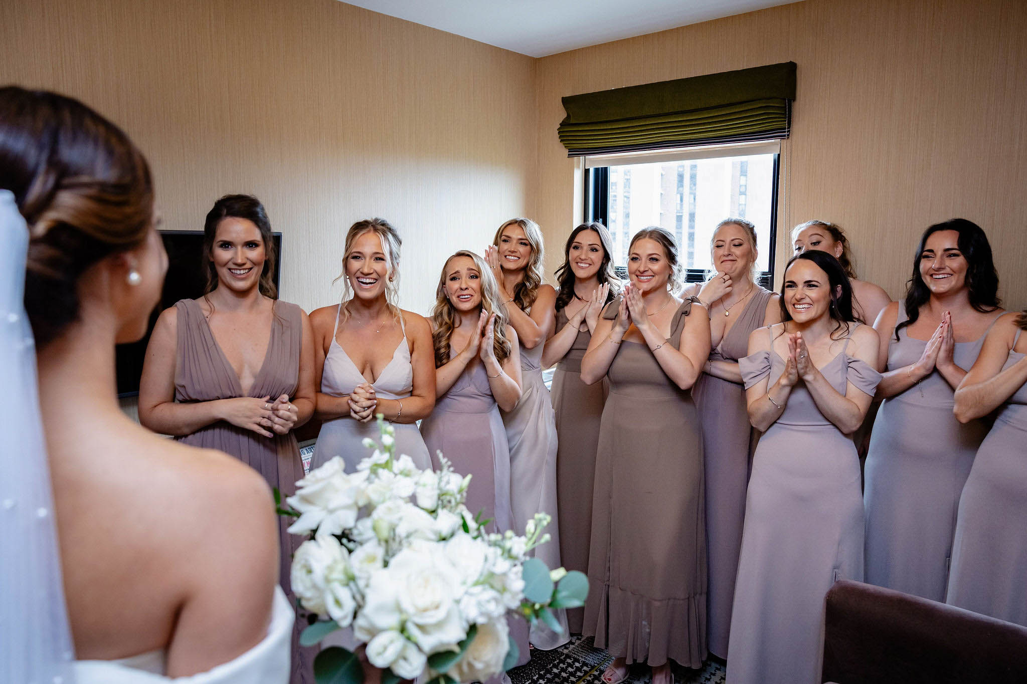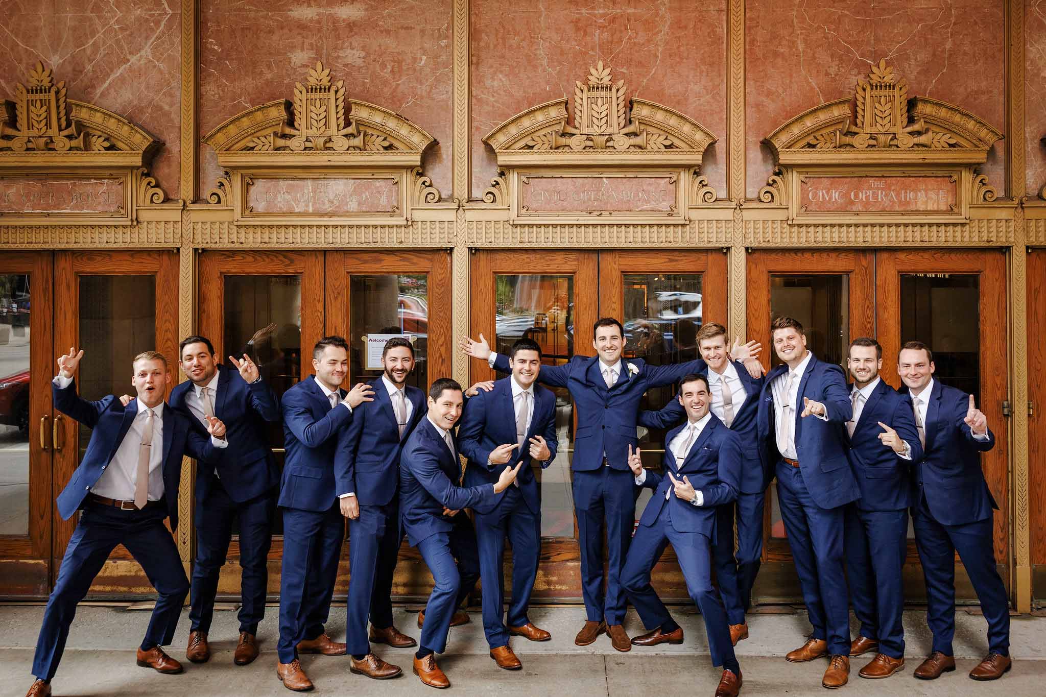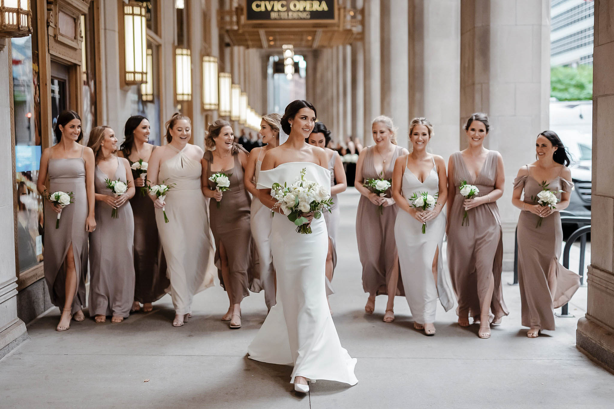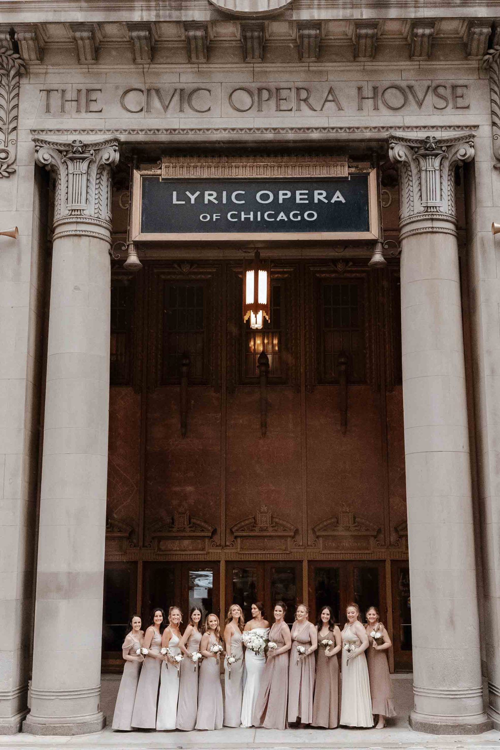 Kevin didn’t want his getting ready photographed, so we started with Shannon’s preparations. The rooms at the Lincoln Hotel are small, and Shannon had a huge bridal party—ten bridesmaids! We were all packed into that little suite. It was pretty intense because we didn’t have much time, and it was a good thing both photographers were there. The day was cloudy, and then the rain started. Her mother and sister helped her get dressed. Shannon is very close to her family and had a first look with her father at the hotel. The whole family was deeply emotional. We changed our photo location plans several times, but the rain forced us to go with the Lyric Opera because it had a covered area—and because they had a huge wedding party, over twenty people. You really have to think about where you can work with a group that large. The first look with Kevin was at the Lyric Opera of Chicago. There, we captured their portraits and photos with the huge wedding party. The guys were already there and in great spirits.Since the rain changed our plans, we decided to head to the venue earlier and take some additional portraits and group photos indoors before the ceremony.