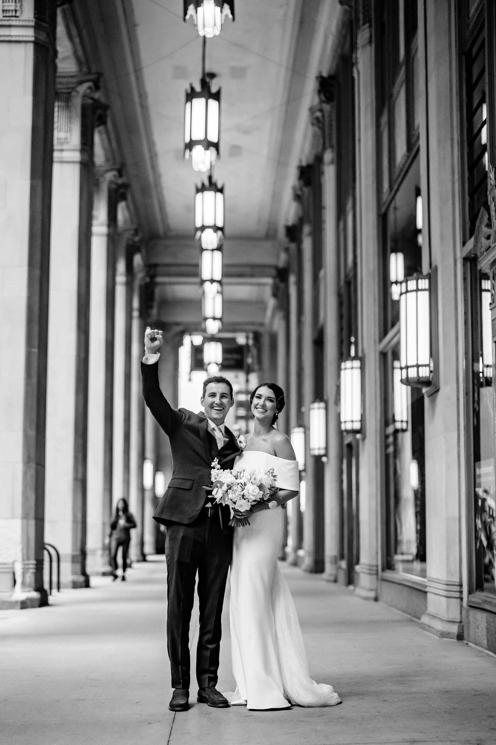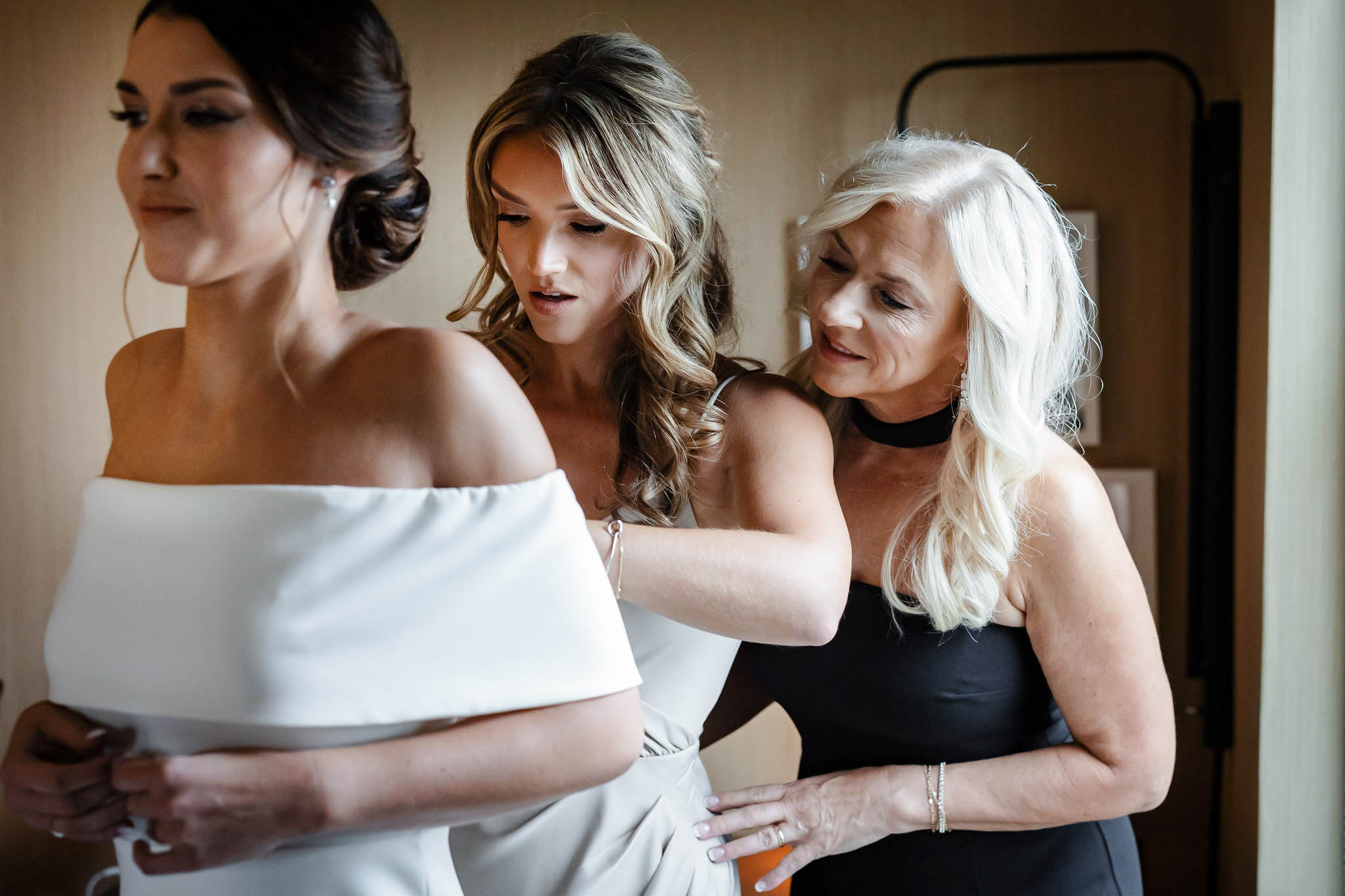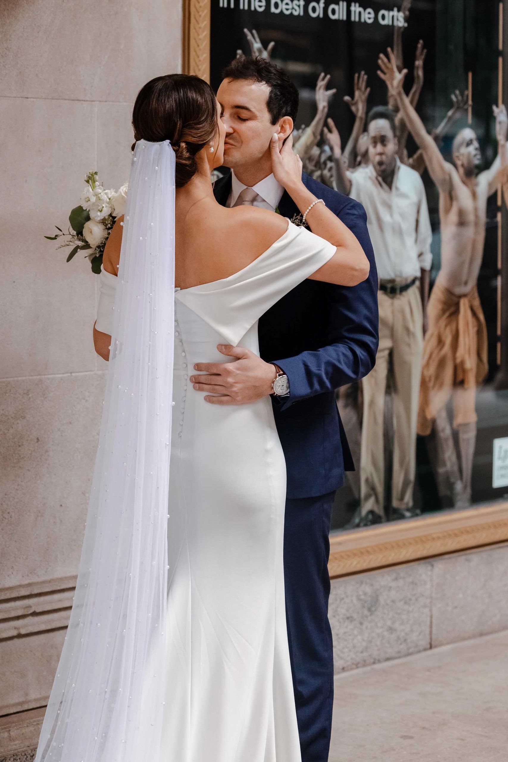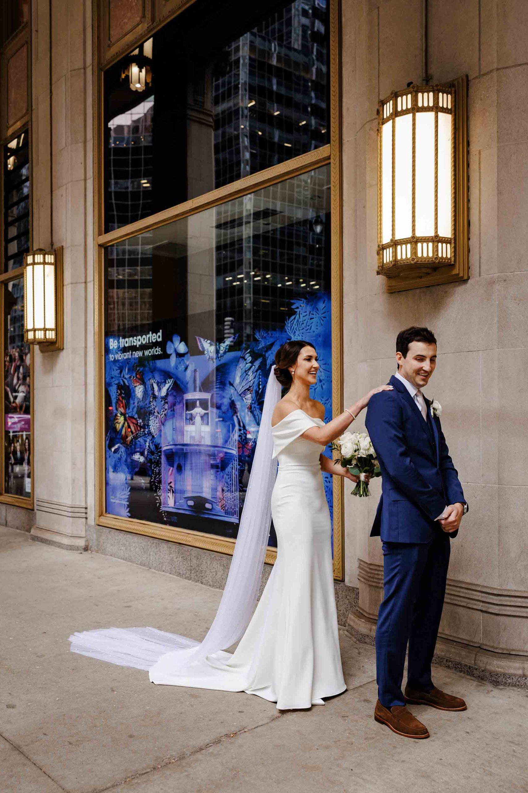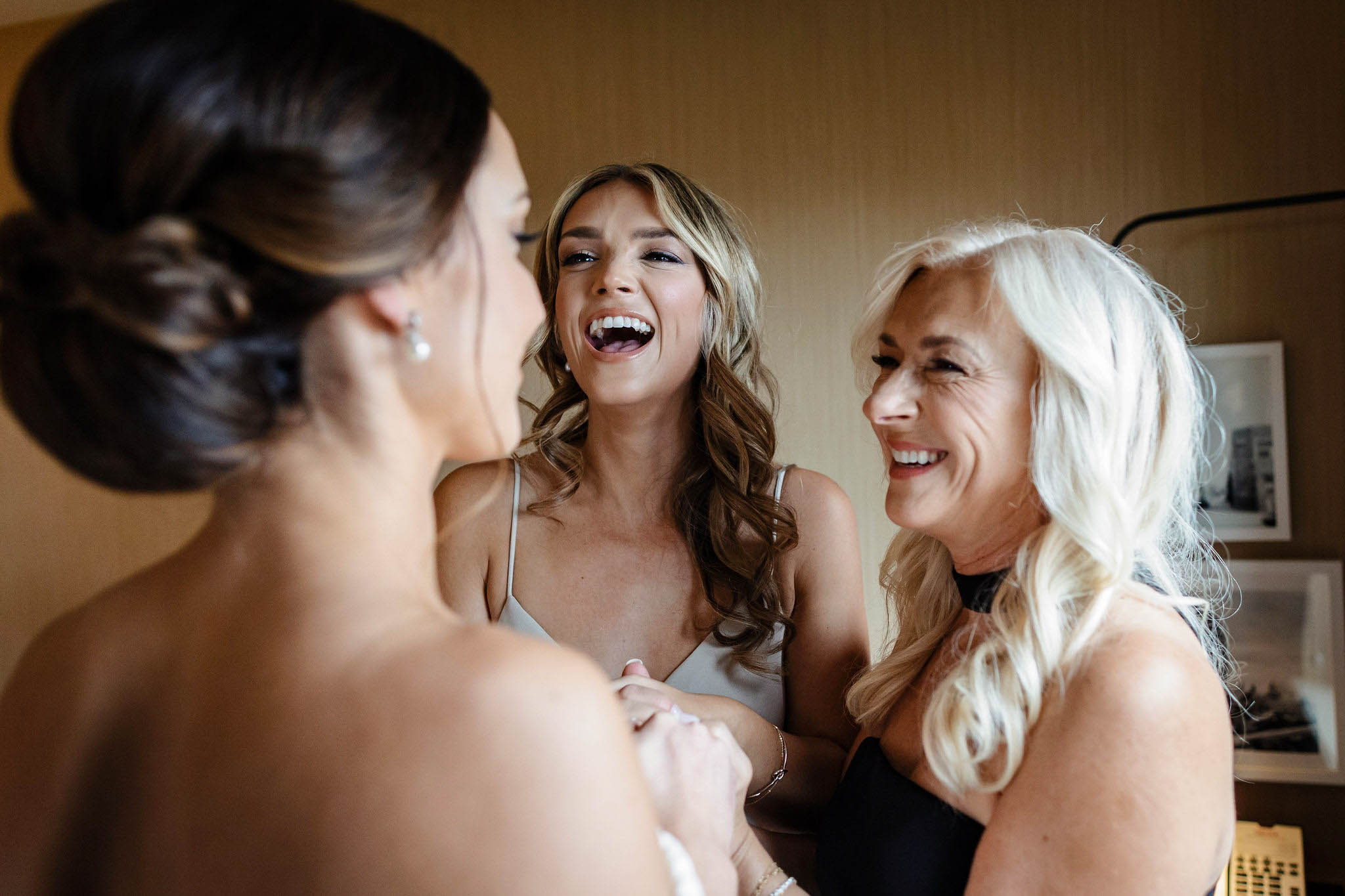 Kevin didn’t want his getting ready photographed, so we started with Shannon’s preparations. The rooms at the Lincoln Hotel are small, and Shannon had a huge bridal party—ten bridesmaids! We were all packed into that little suite. It was pretty intense because we didn’t have much time, and it was a good thing both photographers were there. The day was cloudy, and then the rain started. Her mother and sister helped her get dressed. Shannon is very close to her family and had a first look with her father at the hotel. The whole family was deeply emotional. We changed our photo location plans several times, but the rain forced us to go with the Lyric Opera because it had a covered area—and because they had a huge wedding party, over twenty people. You really have to think about where you can work with a group that large. The first look with Kevin was at the Lyric Opera of Chicago. There, we captured their portraits and photos with the huge wedding party. The guys were already there and in great spirits.Since the rain changed our plans, we decided to head to the venue earlier and take some additional portraits and group photos indoors before the ceremony.