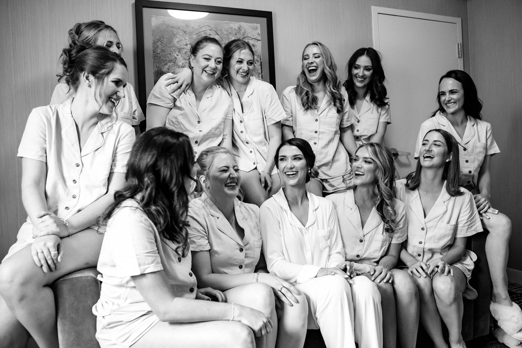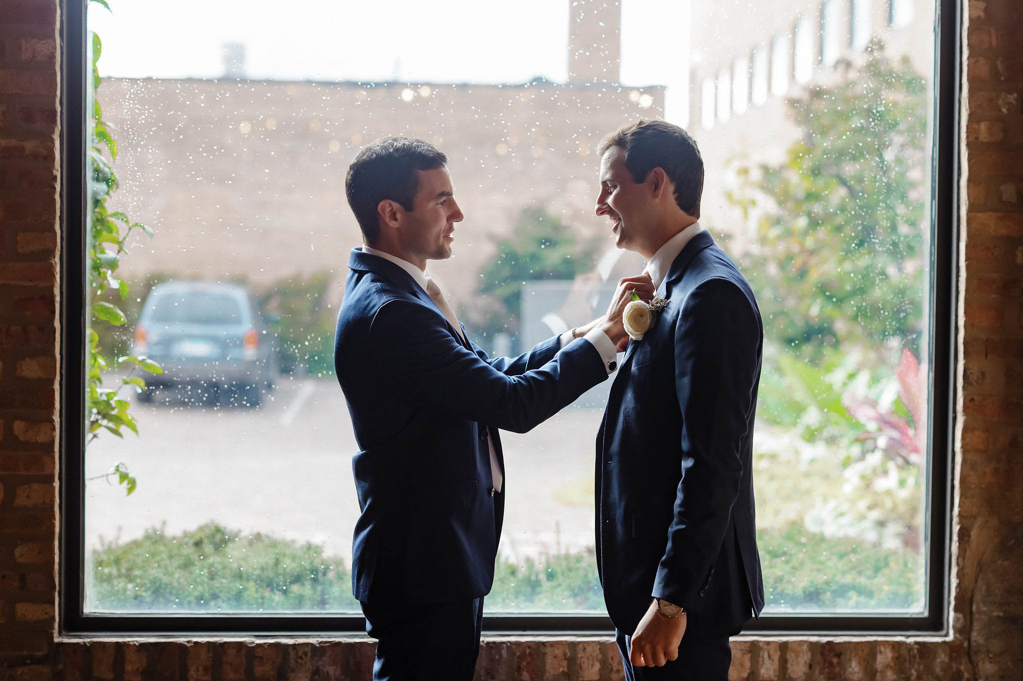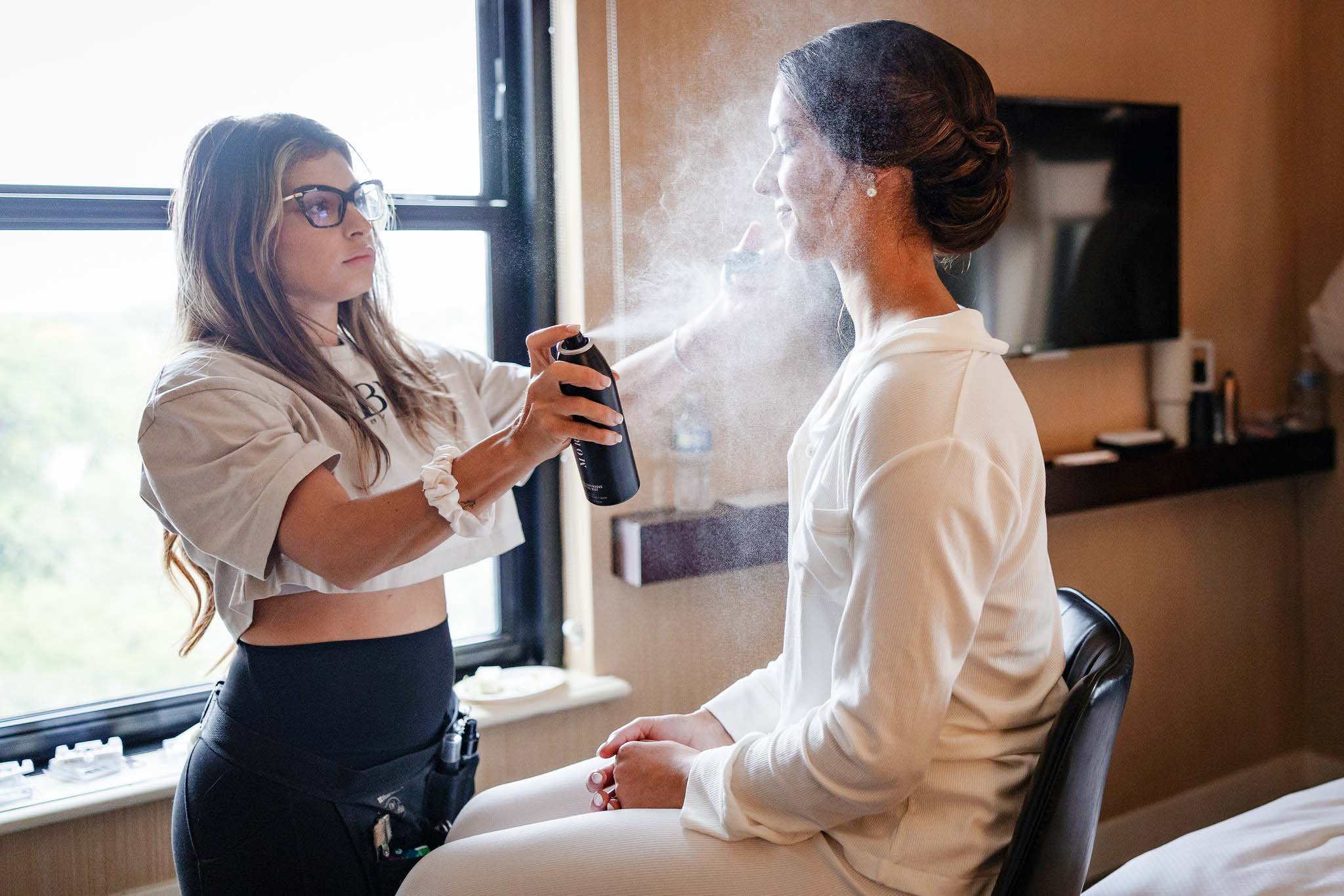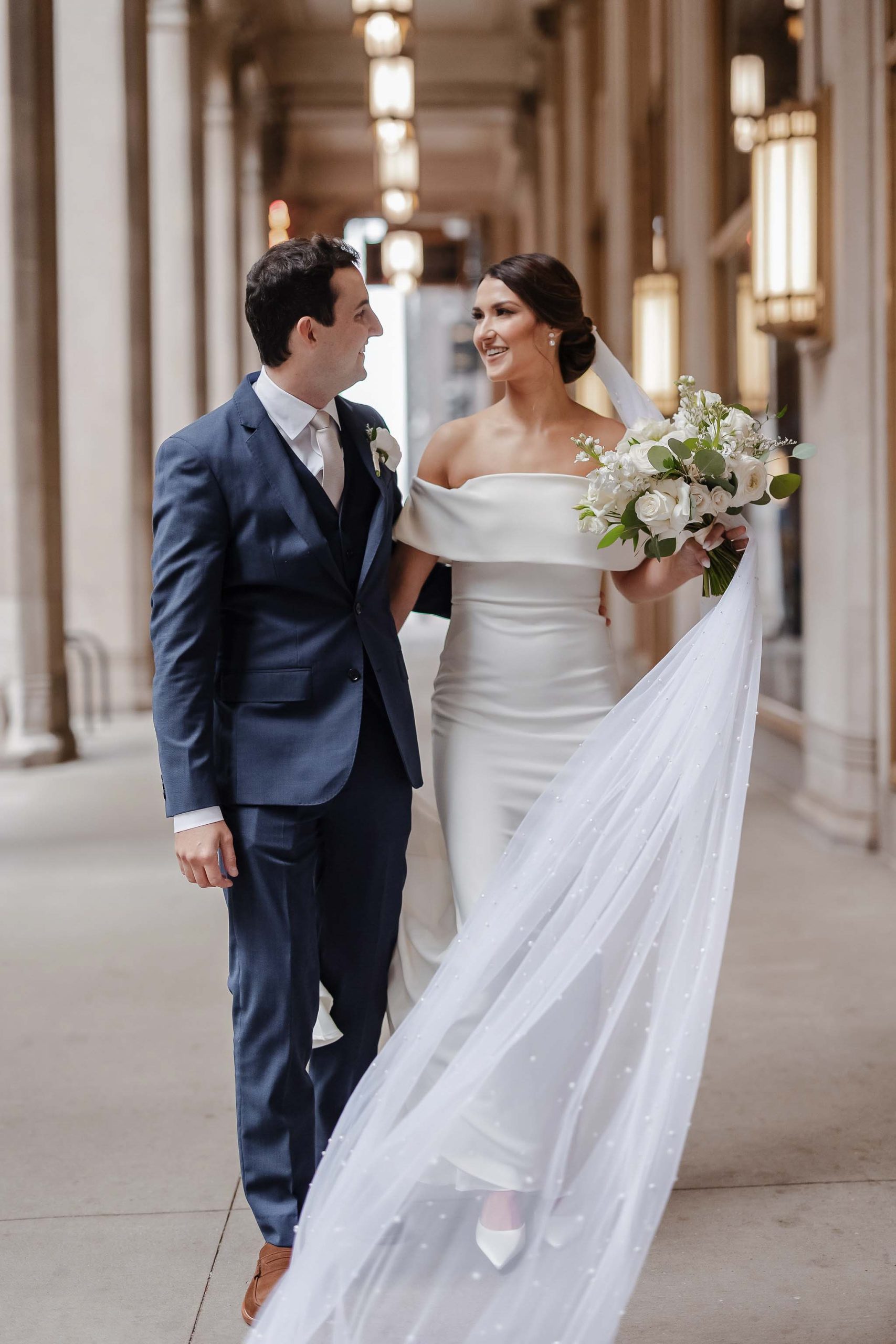 Kevin didn’t want his getting ready photographed, so we started with Shannon’s preparations. The rooms at the Lincoln Hotel are small, and Shannon had a huge bridal party—ten bridesmaids! We were all packed into that little suite. It was pretty intense because we didn’t have much time, and it was a good thing both photographers were there. The day was cloudy, and then the rain started. Her mother and sister helped her get dressed. Shannon is very close to her family and had a first look with her father at the hotel. The whole family was deeply emotional. We changed our photo location plans several times, but the rain forced us to go with the Lyric Opera because it had a covered area—and because they had a huge wedding party, over twenty people. You really have to think about where you can work with a group that large. The first look with Kevin was at the Lyric Opera of Chicago. There, we captured their portraits and photos with the huge wedding party. The guys were already there and in great spirits.Since the rain changed our plans, we decided to head to the venue earlier and take some additional portraits and group photos indoors before the ceremony.