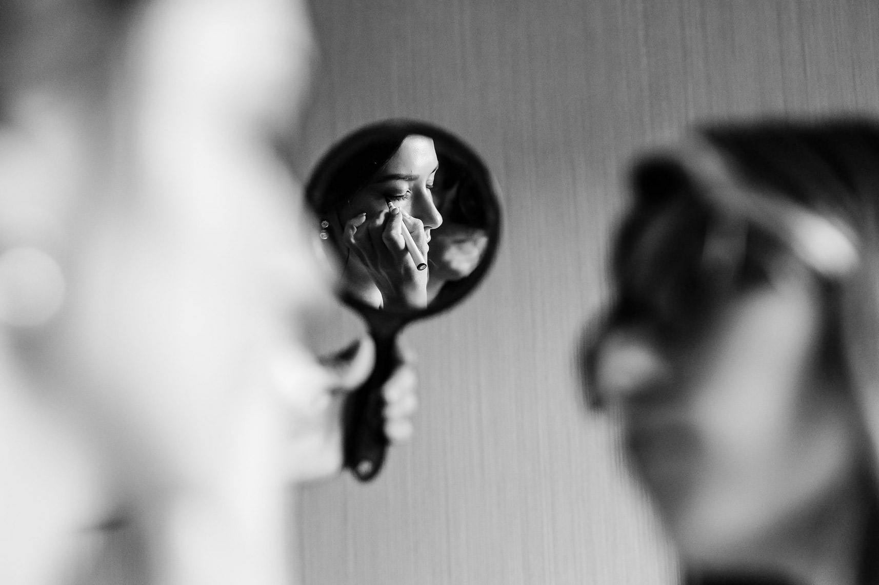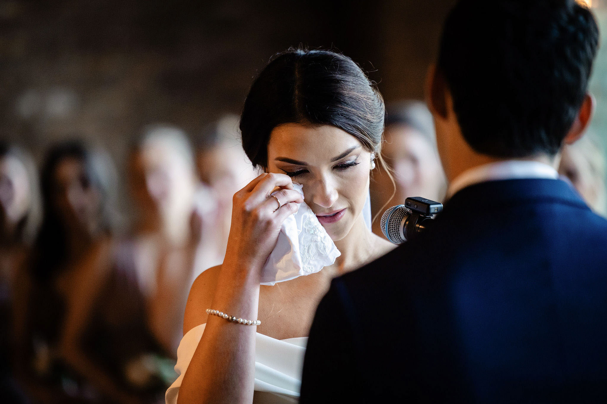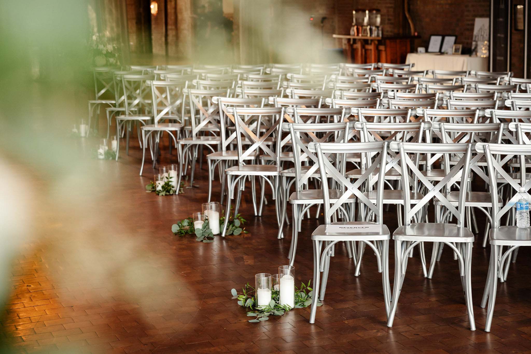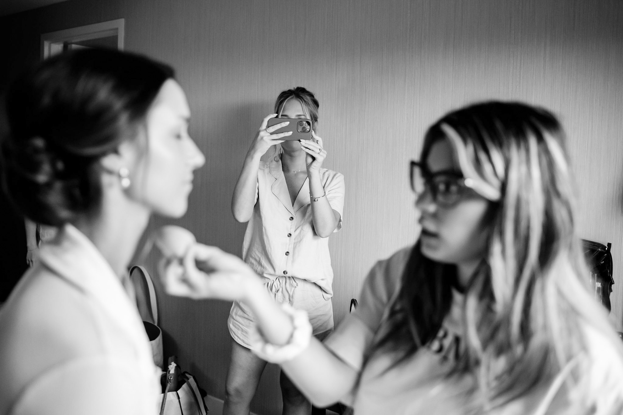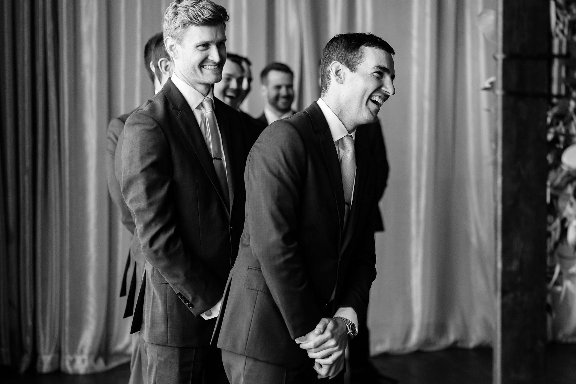Kevin didn’t want his getting ready photographed, so we started with Shannon’s preparations. The rooms at the Lincoln Hotel are small, and Shannon had a huge bridal party—ten bridesmaids! We were all packed into that little suite. It was pretty intense because we didn’t have much time, and it was a good thing both photographers were there. The day was cloudy, and then the rain started. Her mother and sister helped her get dressed. Shannon is very close to her family and had a first look with her father at the hotel. The whole family was deeply emotional. We changed our photo location plans several times, but the rain forced us to go with the Lyric Opera because it had a covered area—and because they had a huge wedding party, over twenty people. You really have to think about where you can work with a group that large. The first look with Kevin was at the Lyric Opera of Chicago. There, we captured their portraits and photos with the huge wedding party. The guys were already there and in great spirits.Since the rain changed our plans, we decided to head to the venue earlier and take some additional portraits and group photos indoors before the ceremony.