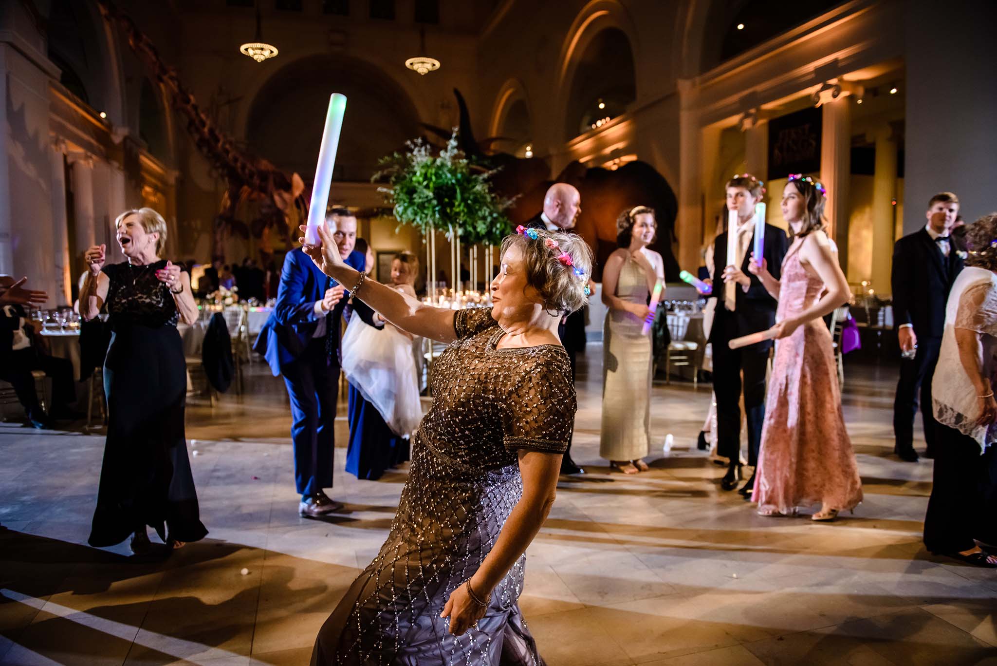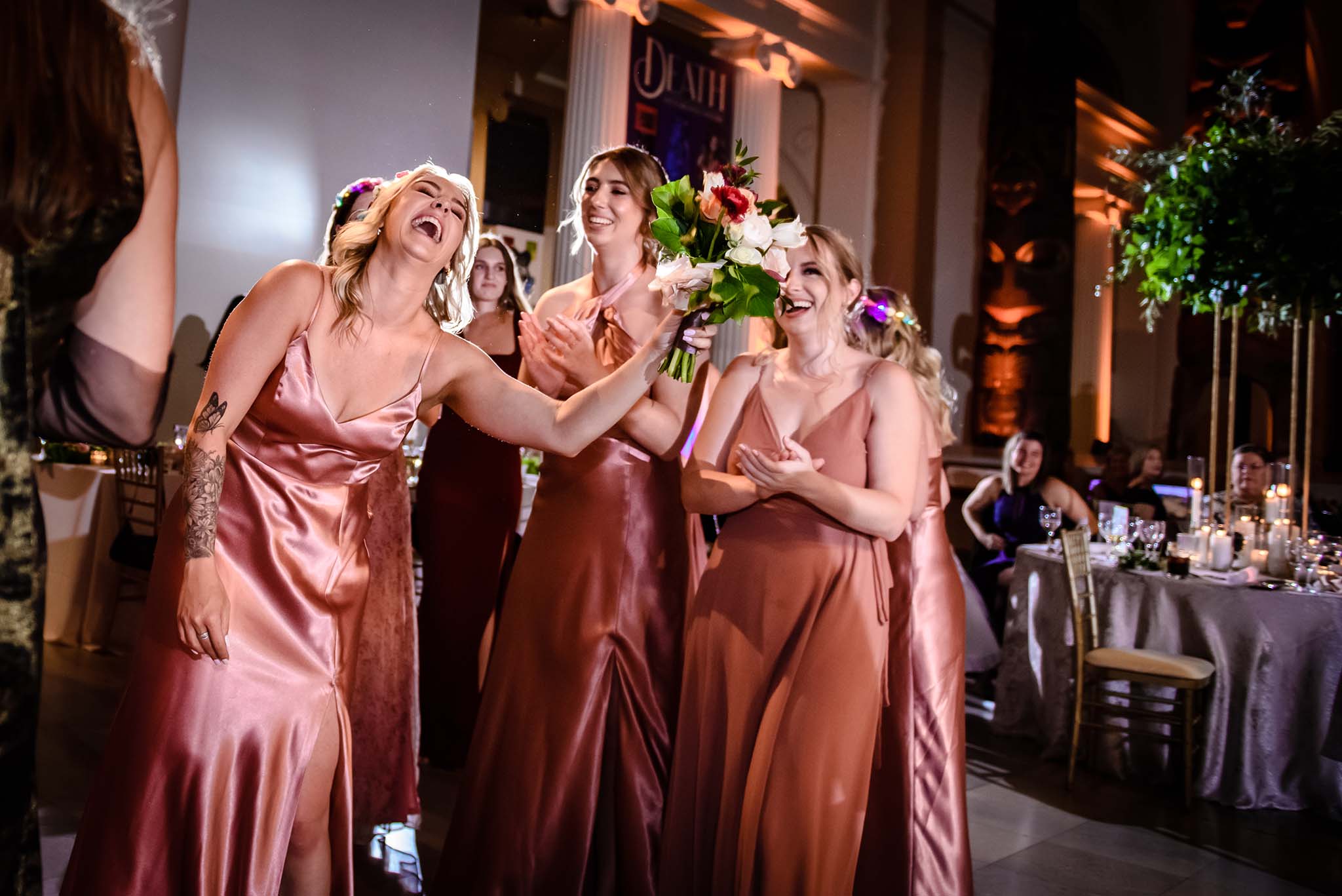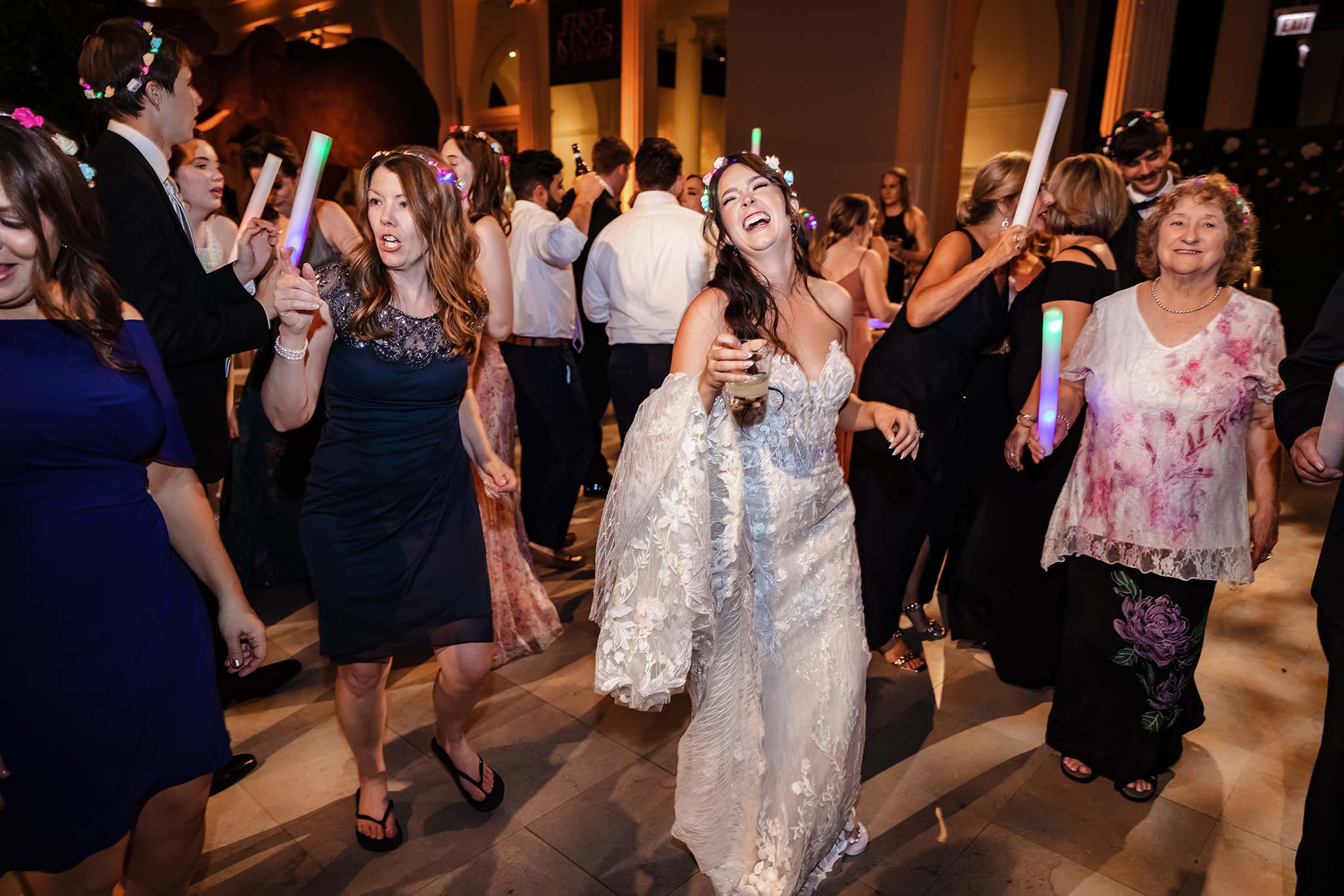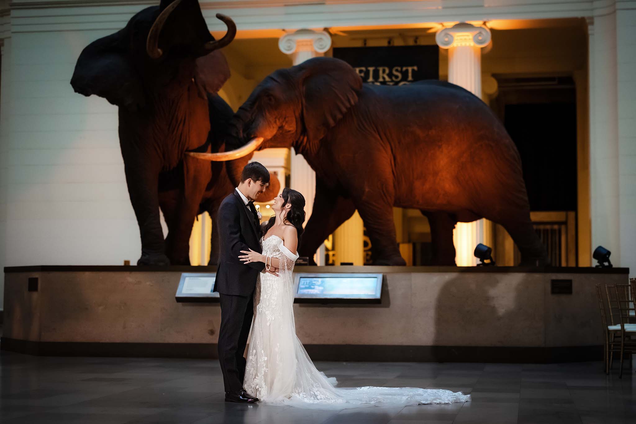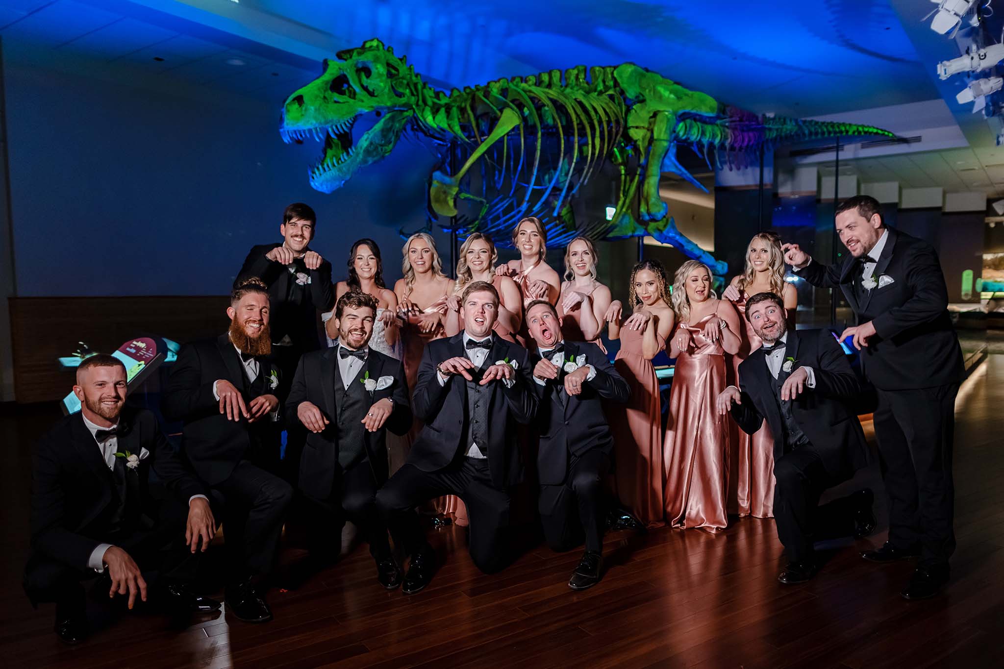 Weddings and receptions at the Field Museum are always scheduled after the museum closes at 5 PM. We arrived on time and had the opportunity to take photos inside the museum. The couple are huge dinosaur lovers and specifically wanted some photos with the wedding party in the dinosaur exhibit area. It was such a fun and unique experience—we truly enjoyed it and were excited to shoot in that setting. The ceremony was set up outside at the North Entrance, beneath the grand staircase, with a stunning view of the city in the background. Everything looked absolutely phenomenal. A live string ensemble added to the atmosphere, making it even more magical. The descent of the wedding party and the bride down the steps turned out perfectly in our photos. Field Museum is truly something special when it comes to weddings. After the ceremony, guests enjoyed cocktail hour while we took a few more sunset portraits of the couple. The reception space—framed by mammoths in the background and prehistoric birds suspended from the ceiling—is absolutely breathtaking. If you’re looking for a unique and unforgettable wedding experience, this is the place. After dinner, the celebration continued with a lively party. The atmosphere was filled with joy and energy—so many happy, smiling faces. In a venue like this, it’s almost impossible to feel anything but excited. In one word, we were blown away by this wedding.