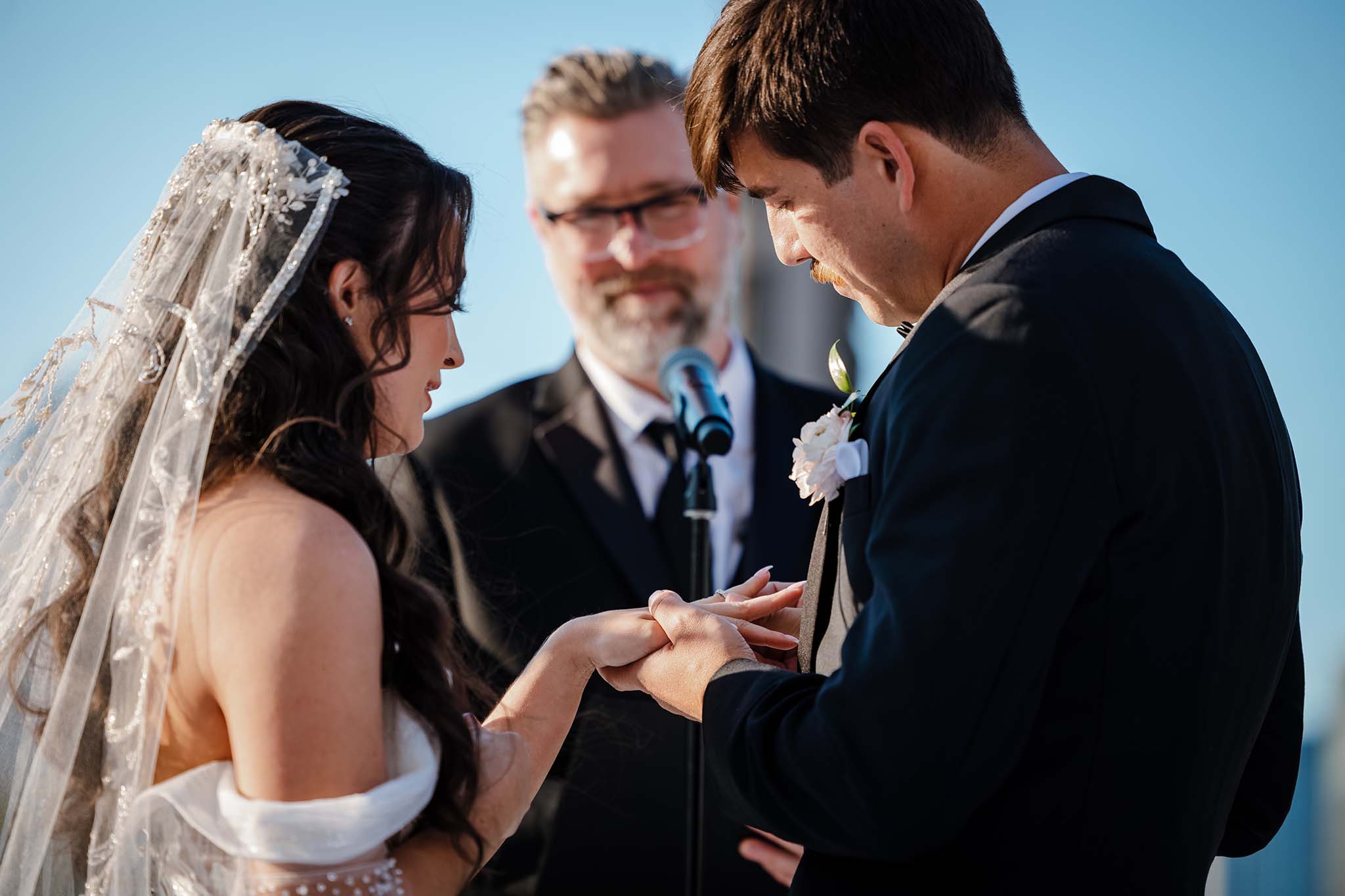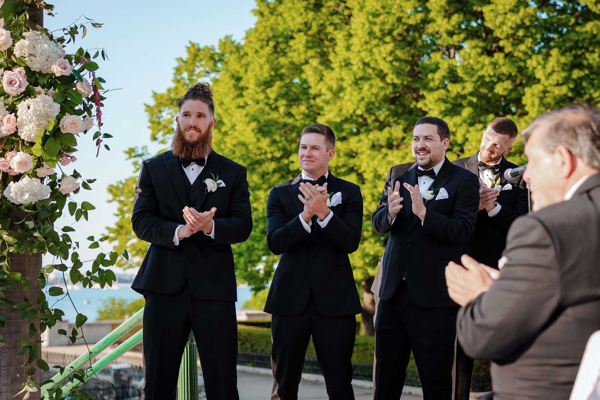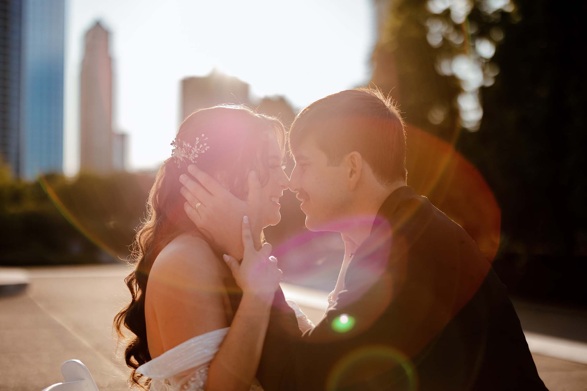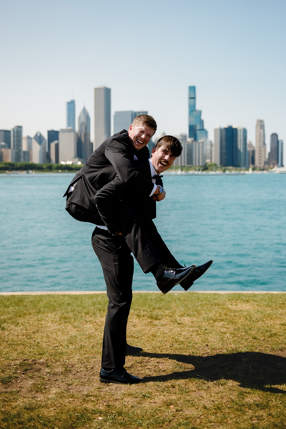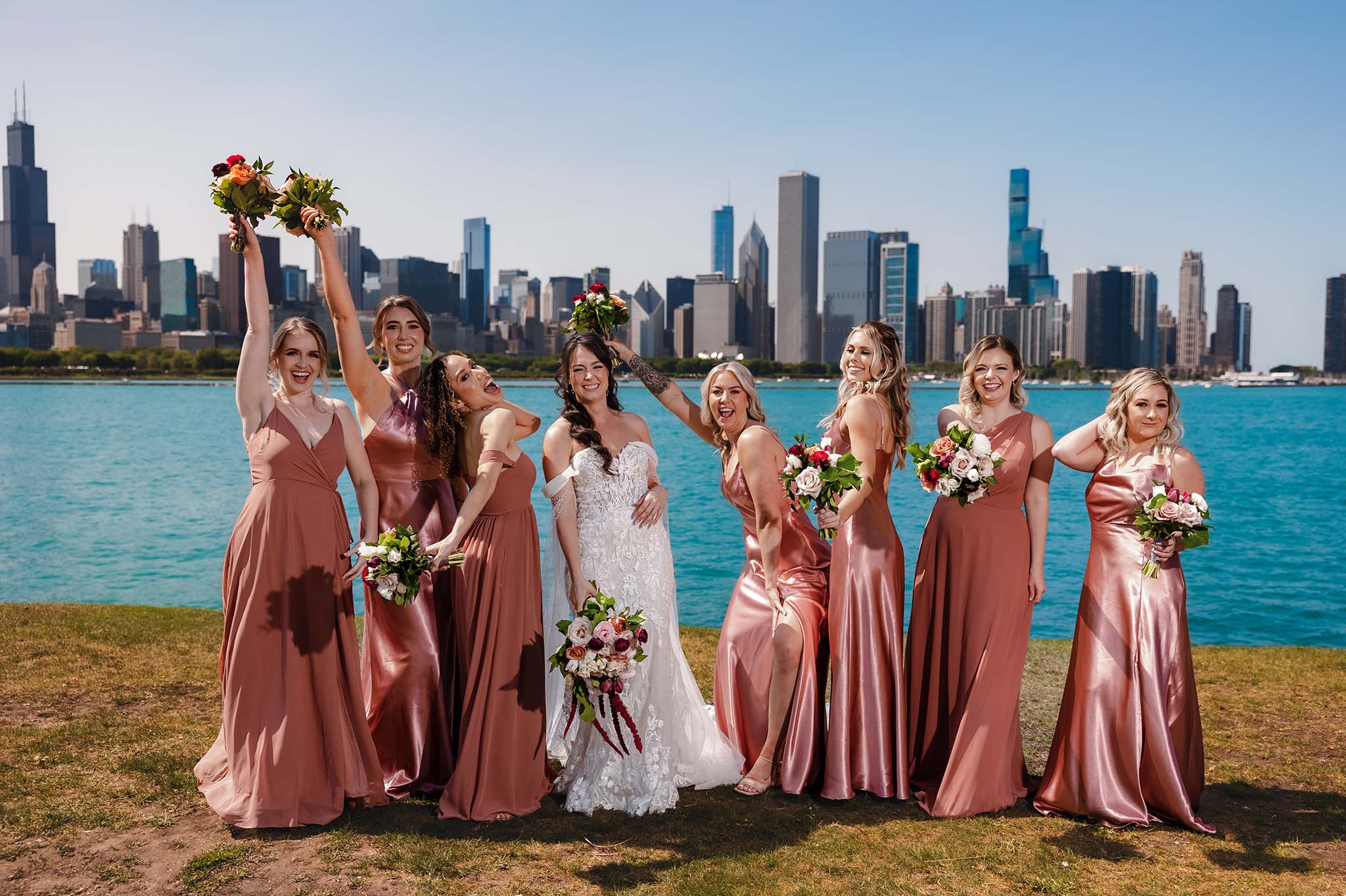 Trolley brought Chelsea and the bridesmaids to the spot where the first look was set to happen. For this wedding, we were in charge of both photo and video. When both teams are involved, good coordination is essential to make sure everything is captured beautifully. It’s important to plan where each person stands so we don’t get in each other’s way—especially with a four-person team. The sun was very strong, so we chose a shaded spot for the first look. Chelsie was truly excited and wanted the moment to be just between her and Bryce. The rest of the wedding party stayed at a distance. It was a very emotional moment for both of them. We continued with photo and video coverage in Grant Park. After that location, we headed to the Museum Campus, where their ceremony was scheduled near the Field Museum. We captured more beautiful photos at one of the best spots for a skyline view of Chicago, with the entire city in the background.